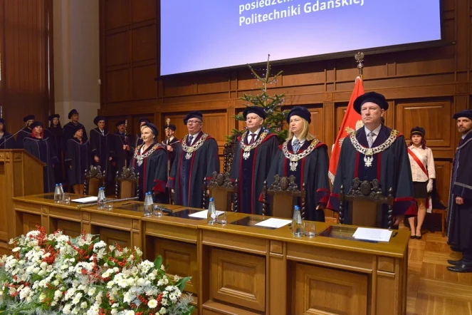 W uroczystym posiedzeniu Senatu PG udział wzięli Beata Rutkiewicz, wojewoda pomorska, prof. Krzysztof Wilde, rektor PG, a także członkowie kolegium rektora, przedstawiciele władz wydziałów, samorządu studentów oraz zaproszeni goście.